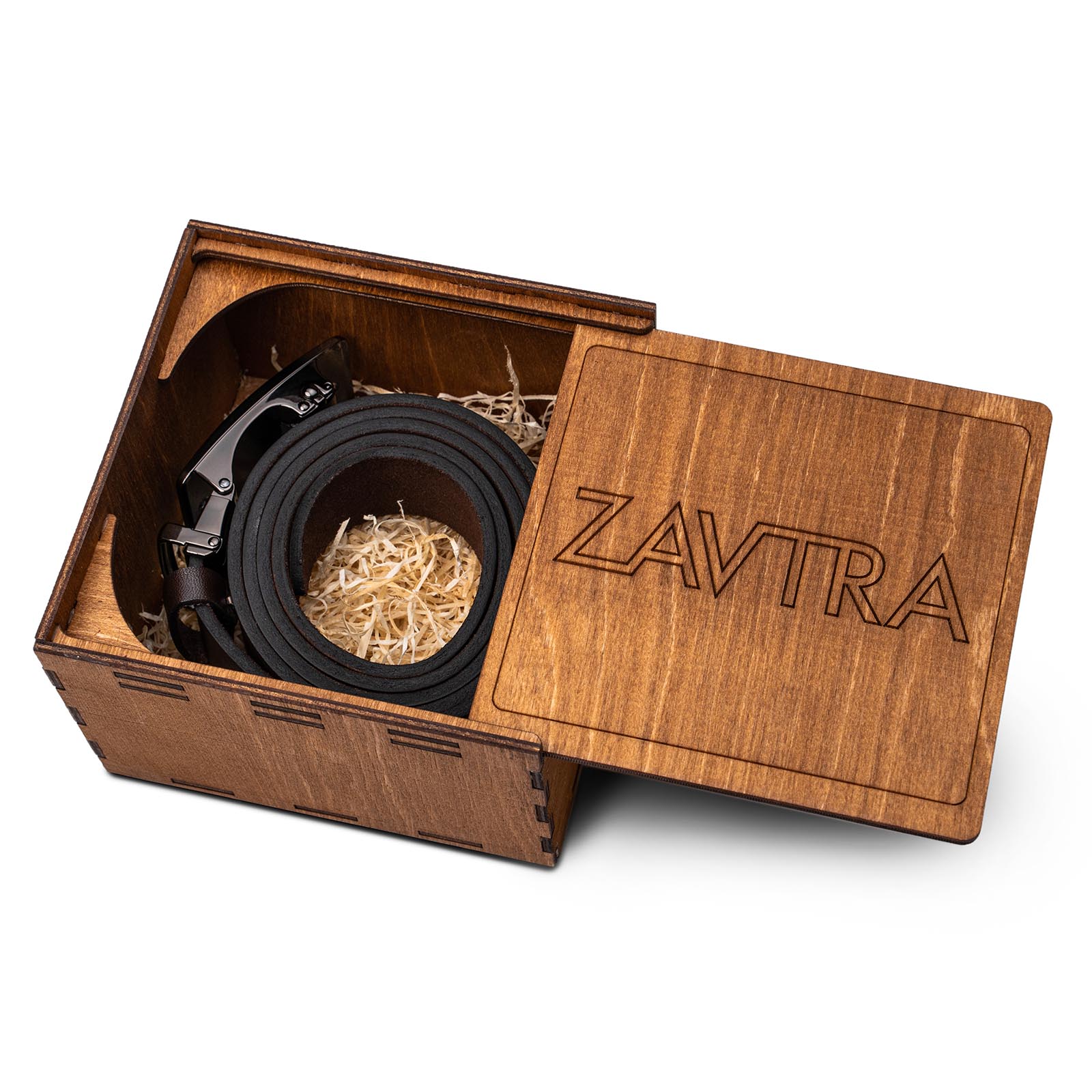 Умный ремень упакован в коробку из фанеры и станет прекрасным подарком для всех, кто ценит качественные аксессуары.