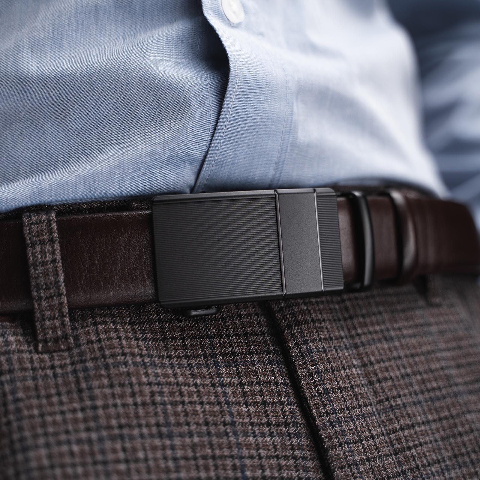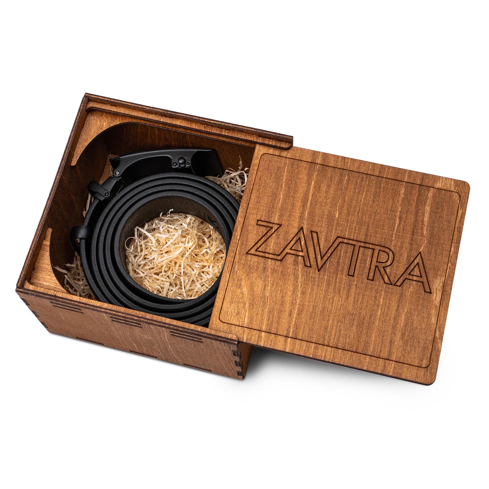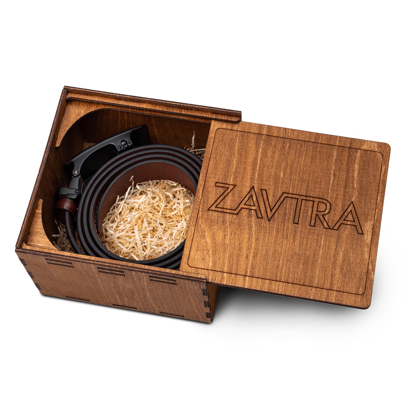 Умный ремень упакован в коробку из фанеры и станет прекрасным подарком для всех, кто ценит качественные аксессуары.