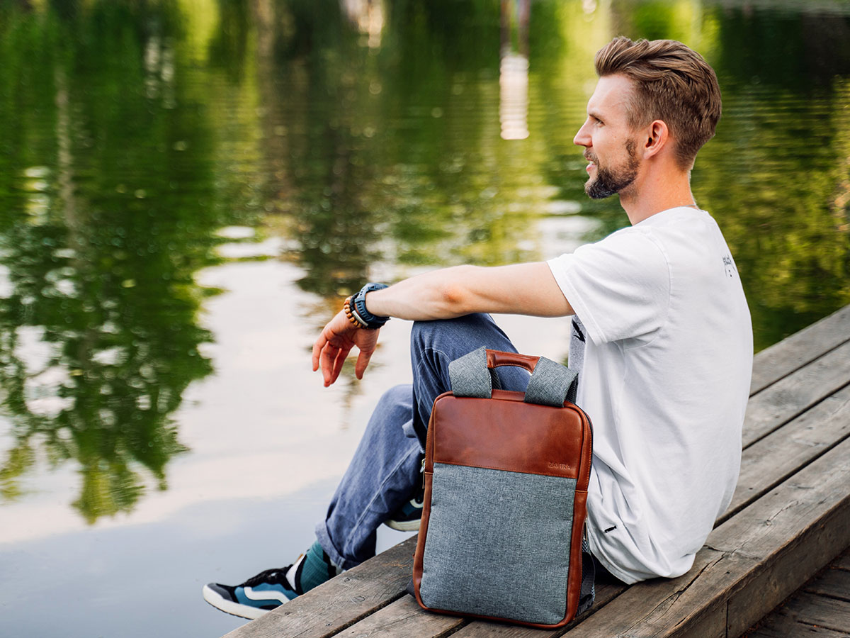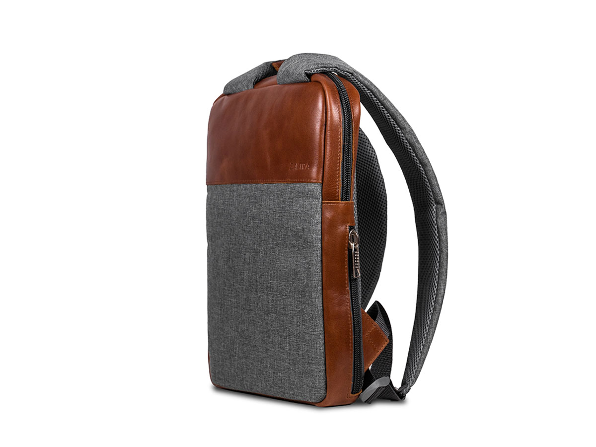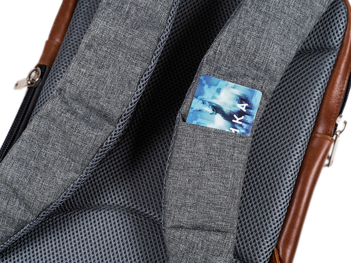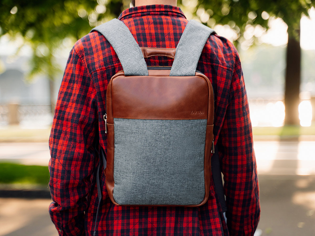 Рюкзак сделан из натуральной кожи. Материал тканевых вставок — катионик. Спинка — мягкая и дышащая, благодаря неопрену.