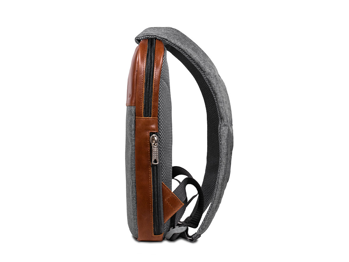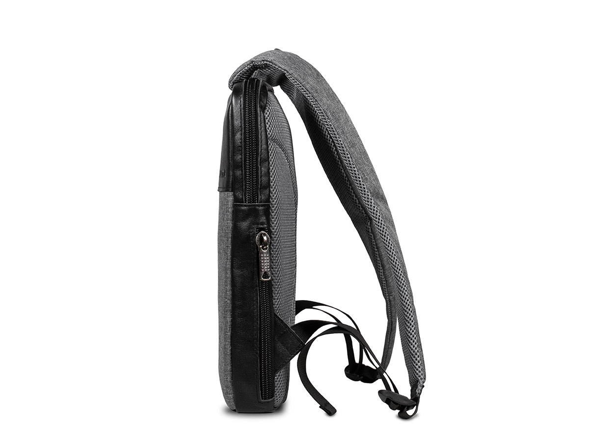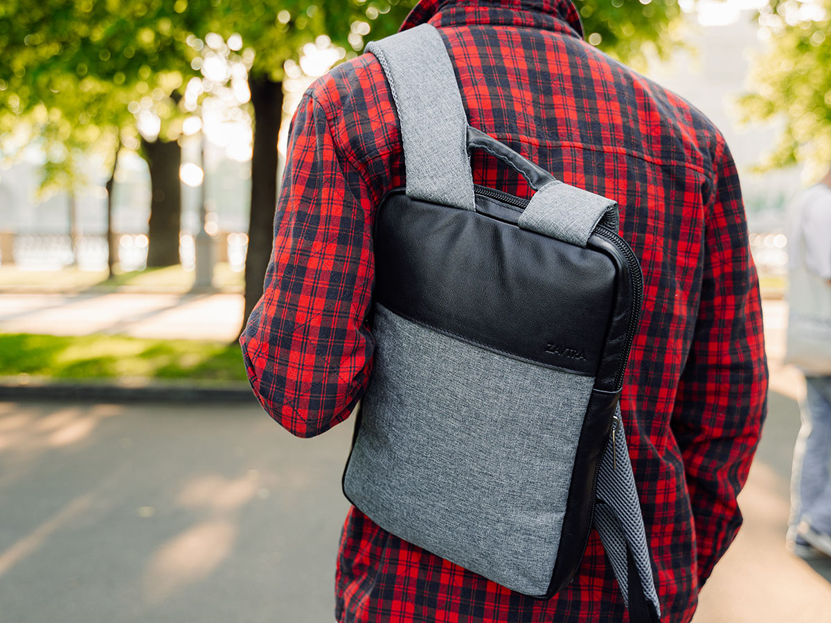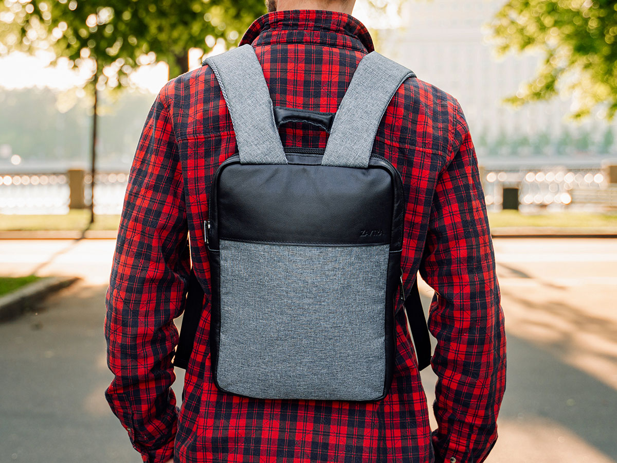 В рюкзаке два отделения с молниями. Основное — для ноутбука или планшета. Боковое подойдет для документов или мобильного телефона и зарядки. Оно сделано таким образом, чтобы вы могли получить доступ к содержимому, просто перевесив рюкзак на правое плечо.