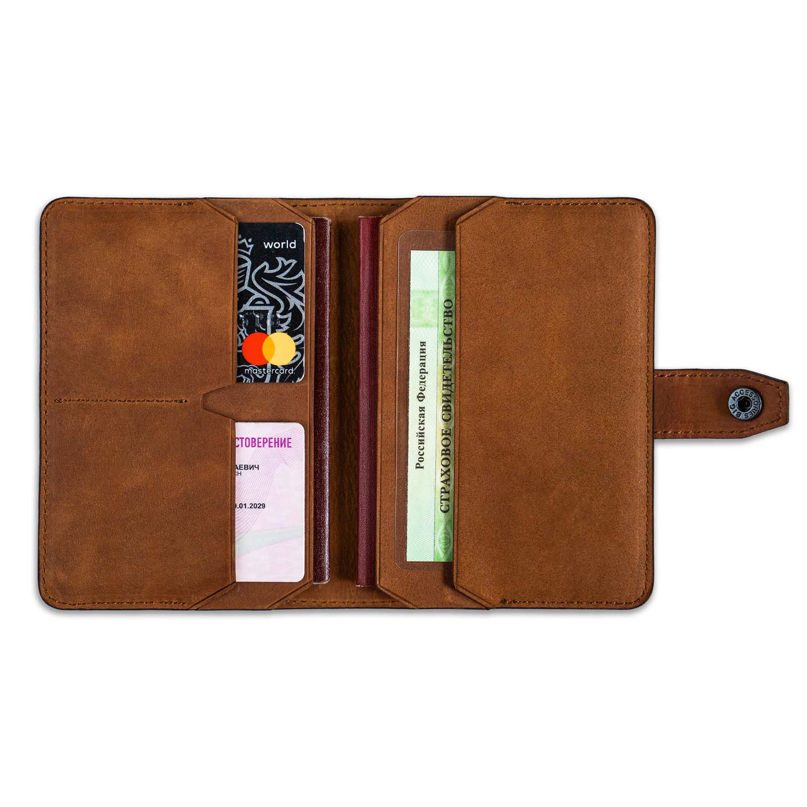 Особенность конструкции — большое количество отделений: 3 больших отсека для документов и 2 слота под карты. В портмоне легко поместятся 2 паспорта, 2–4 банковские карты, ПТС, СНИЛС и купюры.