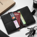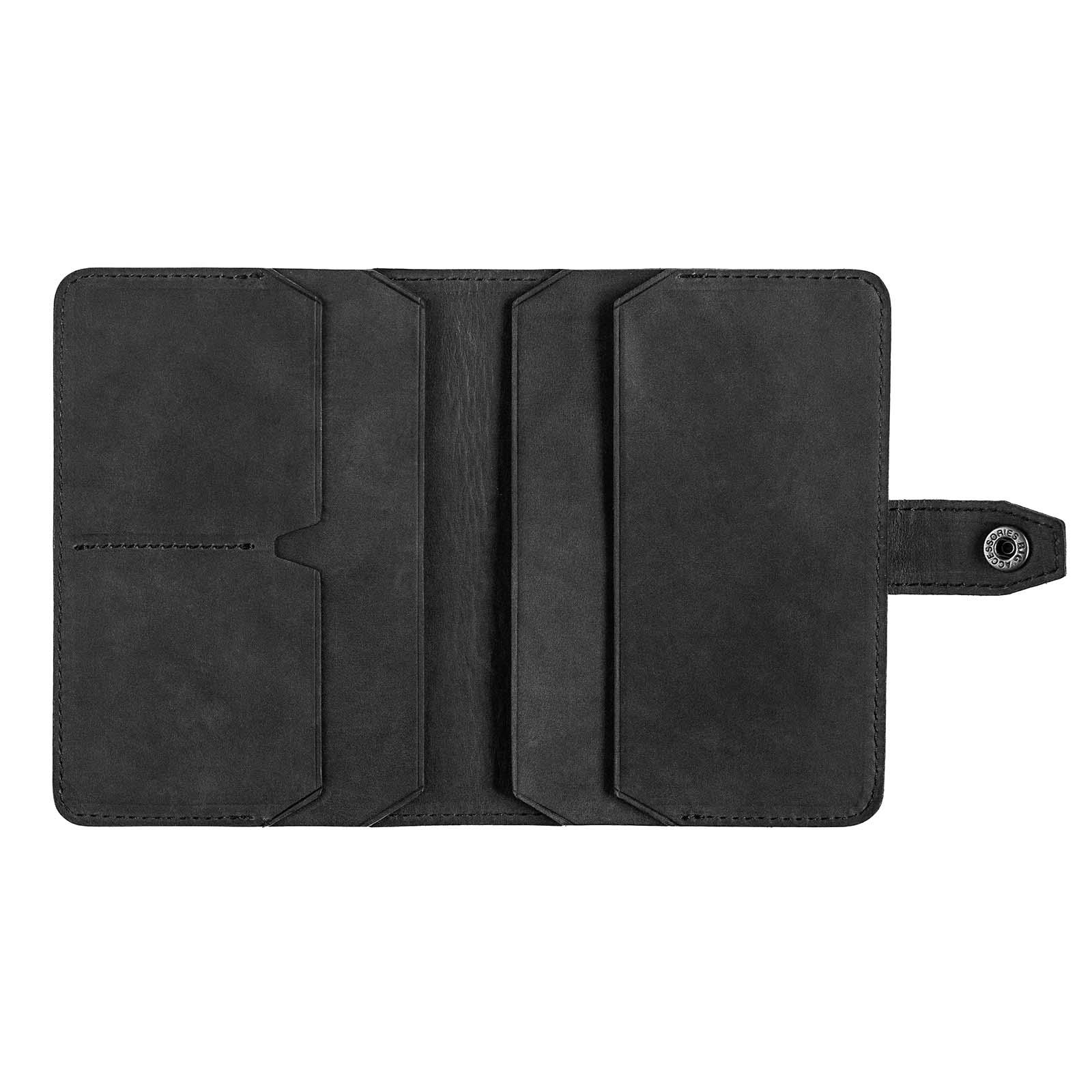 Особенность конструкции — большое количество отделений: 3 больших отсека для документов и 2 слота под карты. В портмоне легко поместятся 2 паспорта, 2–4 банковские карты, ПТС, СНИЛС и купюры.